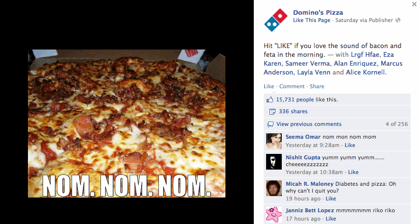 1. Domino’s: This post about the sound of bacon and feta in the morning (what sound does feta make?) got 15,731 likes, 336 shares and 256 comments.