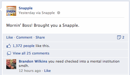 2. Snapple: This simple little post that doesn’t even involve an image got 1,372 likes and 25 comments.