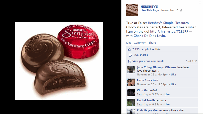 3. Hershey’s: This cheesy true-or-false question post got 7,195 likes, 366 shares and 182 comments.