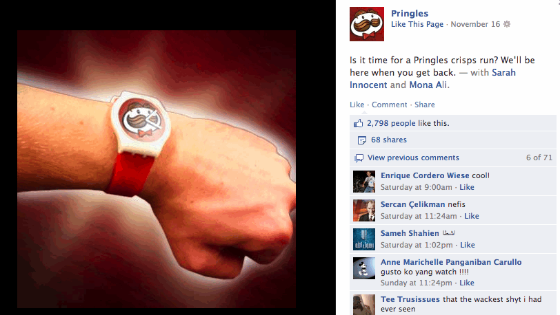 4. Pringles: This corny post letting you know not to worry, that Pringles’ Facebook page will still be here after you go run out to grab more Pringles got 2,798 likes, 68 shares and 71 comments.