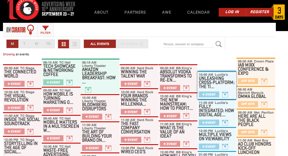 Advertising Week 2013 is upon us. This Monday marks the beginning of the annual week-long gathering of advertising and digital media industry folks in New York City to talk about all things huckster. With 90,000 attendees coming from all over the world to participate in more than 200 official panels and events, Advertising Week can overwhelm even the most seasoned conference goer.