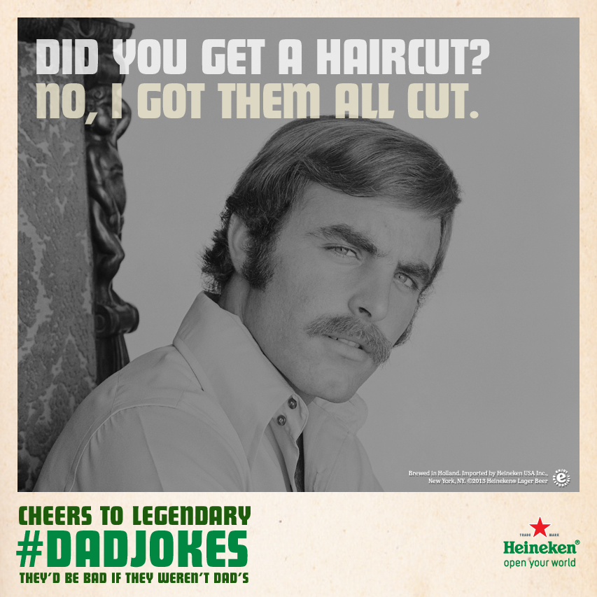 Heineken, with the help of Wieden + Kennedy, is asking people to tweet their favorite dad-style jokes @Heineken_US using the hashtag #dadjokes. You know, those cheesy one-liners and puns that you kind of just have to pity-laugh at. Heinken will pick its favorite jokes and turn them into meme-style image macros by pairing the user-submitted jokes with vintage dad images. Heineken will also create and share some of its own dad jokes on Facebook, Twitter and Instagram.