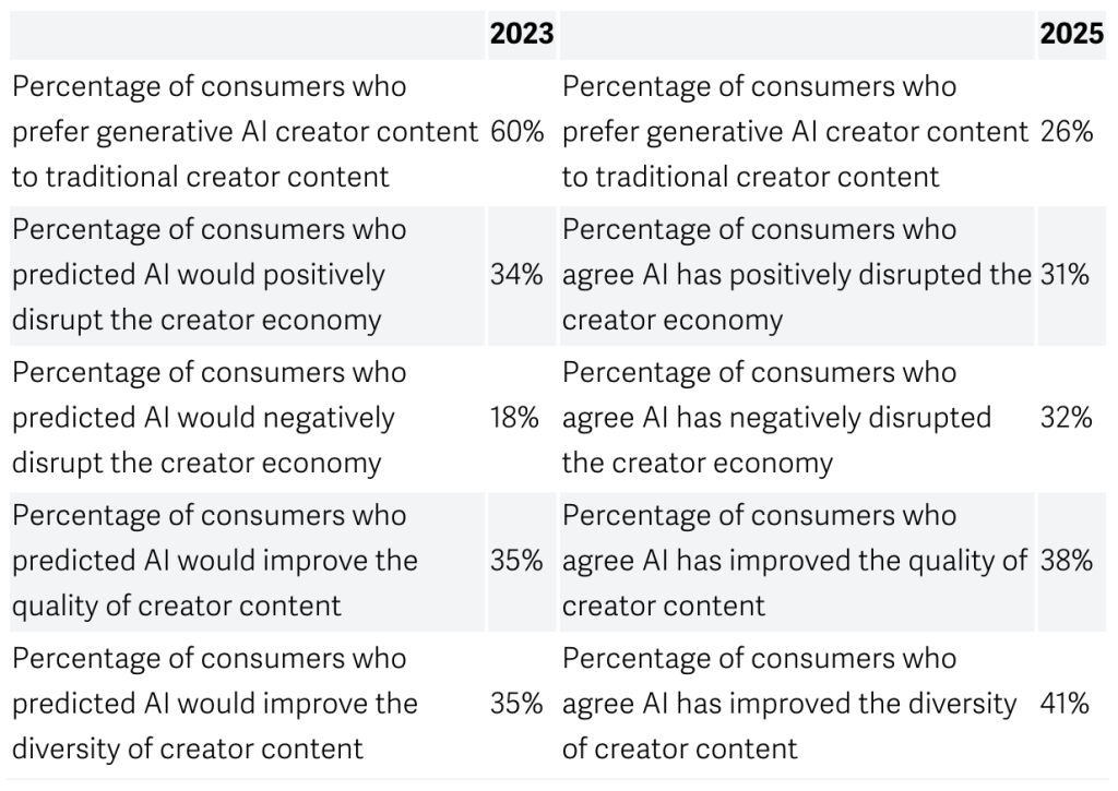 Similarly, around a third (32%) of consumers believe AI has negatively disrupted the creator economy, compared to just 18% of respondents who were asked about their views back in 2023, per the data. When asked if they think AI has positively disrupted the creator economy, 34% believe it had back in 2023, but that’s dipped to just 31% in 2025.
