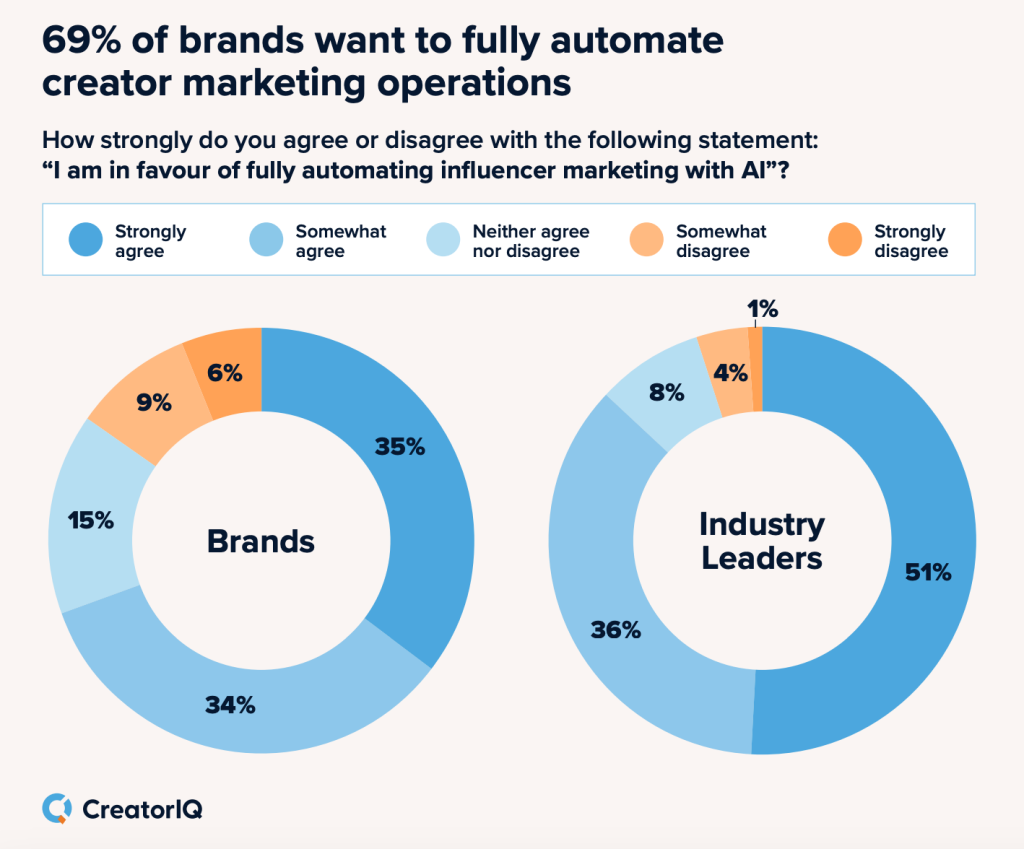 On the flip side, only 6% of brands and 1% of industry leaders “strongly disagree” that influencer marketing should be fully automated with AI.