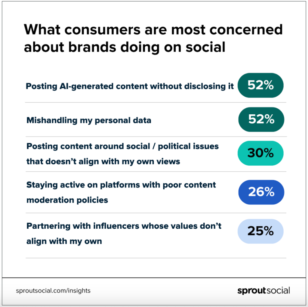 Just over half (52%) of consumers surveyed said that along with mishandling their personal data, their top concern about brands on social media is brands posting AI-generated content without disclosing it, according to Sprout Social’s pulse survey: The State of Social Media in 2025.