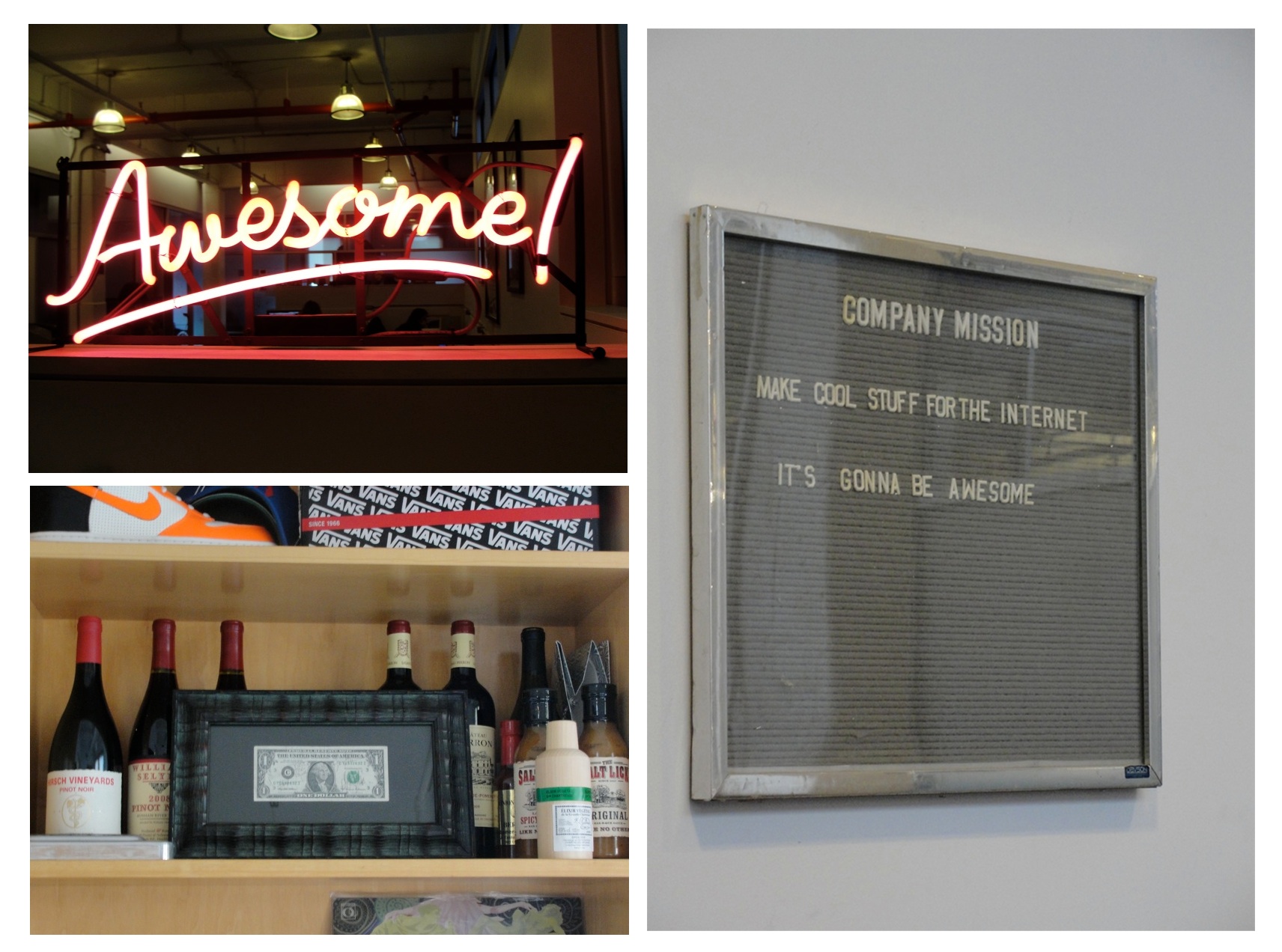 (Items that survived from the company’s early days, when it was run out of founder Benjamin Palmer’s apartment. Neon sign, the company’s mission statement, and the first dollar bill it ever made, which sits in co-founder Keith Butters’ office.)