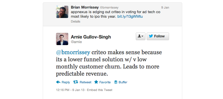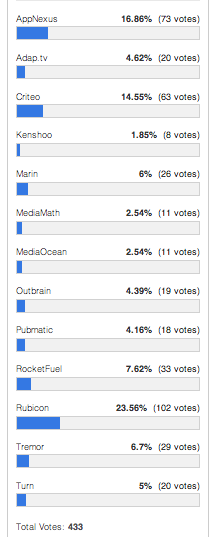 Digiday polled readers on which ad tech company will go public. Out of 400-plus votes, readers predicted Rubicon (24 percent) would be the next ad tech company gearing up to go public. Companies Kenshoo, Marin and Turn fell out of prediction favor, gaining less than 10 percent of votes.