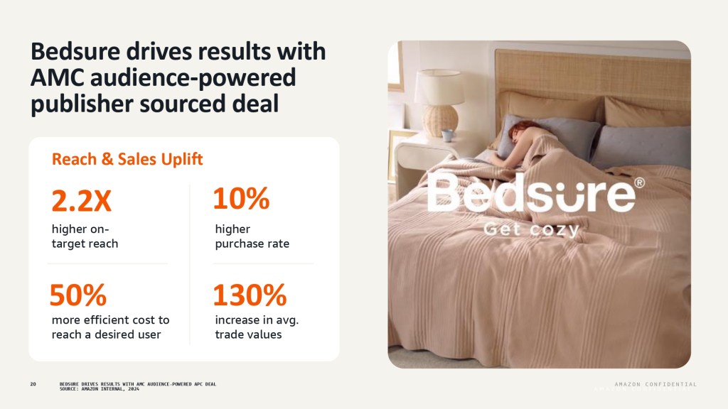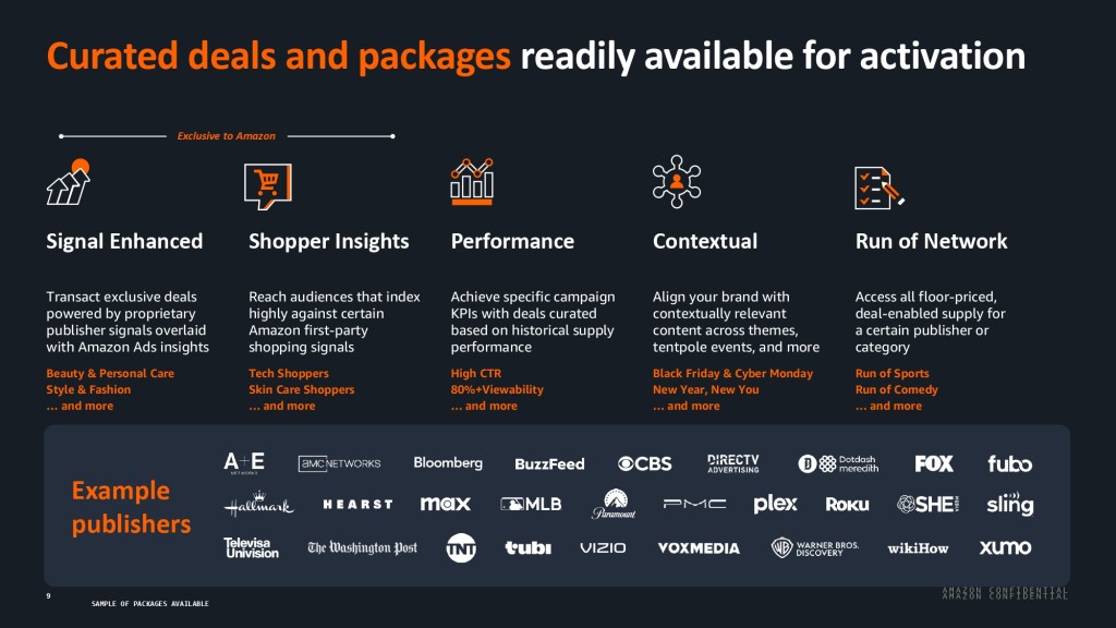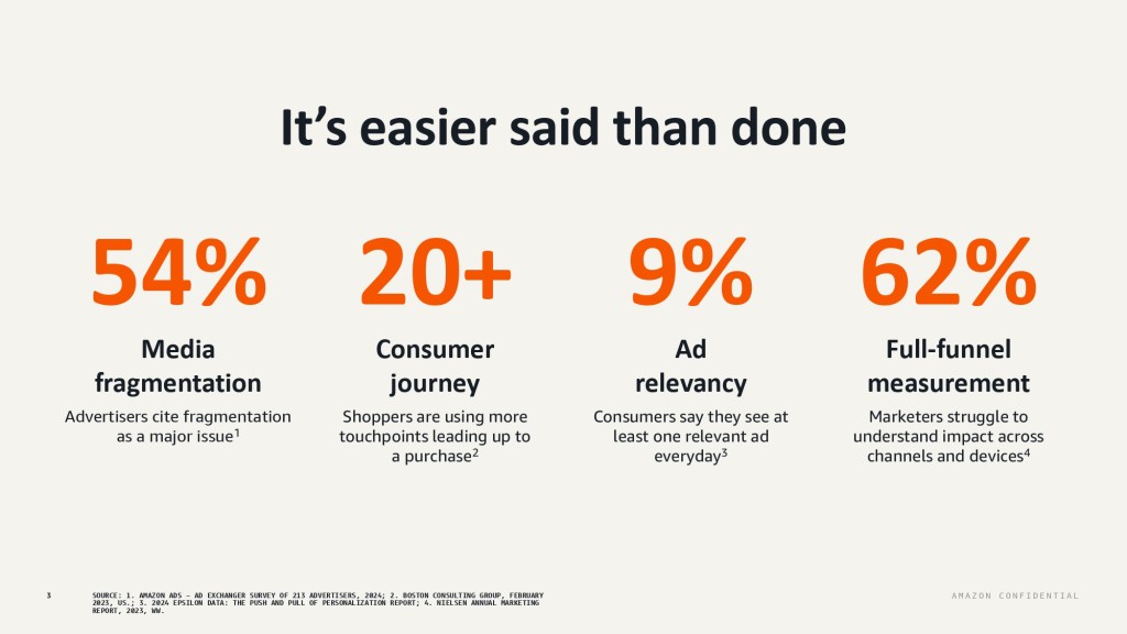 Next, comes a greatest-hits reel of marketing headaches: limited inventory, shaky audience signals, clunky optimization and the ever elusive promise of sharper measurement. Amazon wants marketers to know it’s got answers for all of them, as per slide six.
