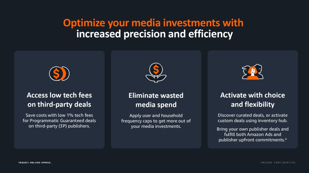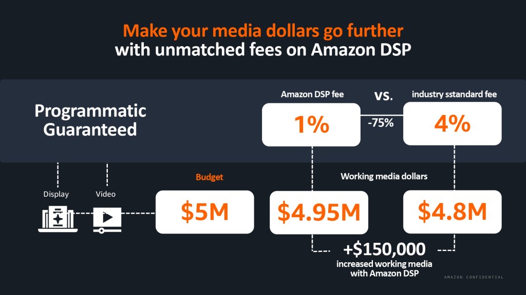 Slide 10 picks up where that one leaves off, offering marketers a visual flex on just how little Amazon takes from those guaranteed deals. It’s a calculated move. These deals remain a preferred buying method for advertisers looking to lock in premium inventory at scale, thanks to the predictability of pre-negotiated impressions and pricing. The message isn’t exactly subtle: Amazon is banking on lower fees particularly for advertisers already transacting heavily on its owned and operated properties to tip more of their budgets into its DSP.