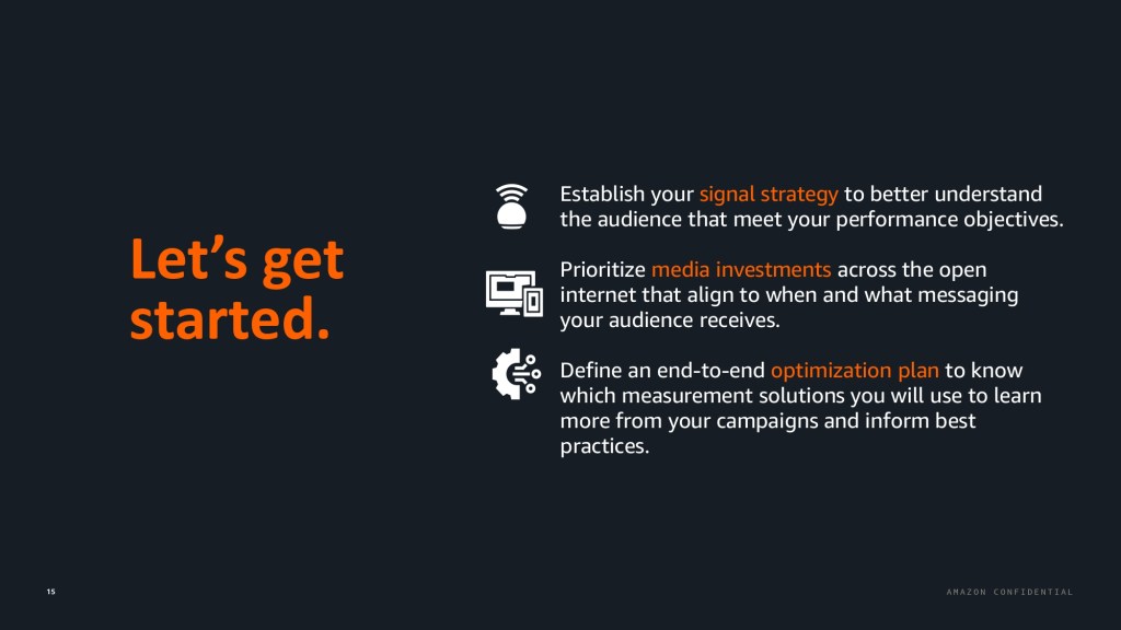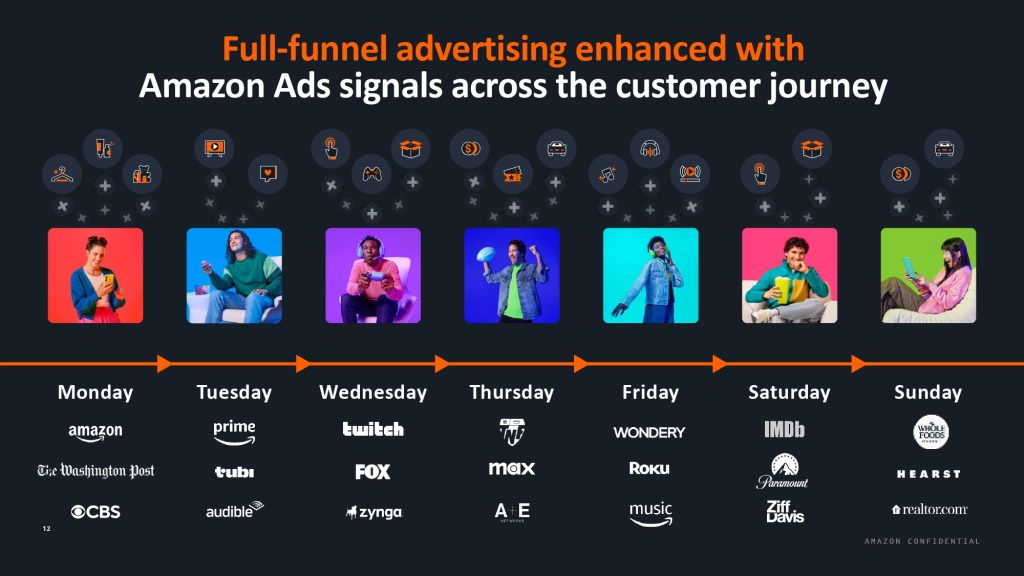 For the skeptics, Slide 12 aims to prove the point. It maps out the audience signals advertisers can tap into over the course of a week-long, full-funnel campaign — showing how Amazon’s data powers targeting both inside its walled garden and beyond it.