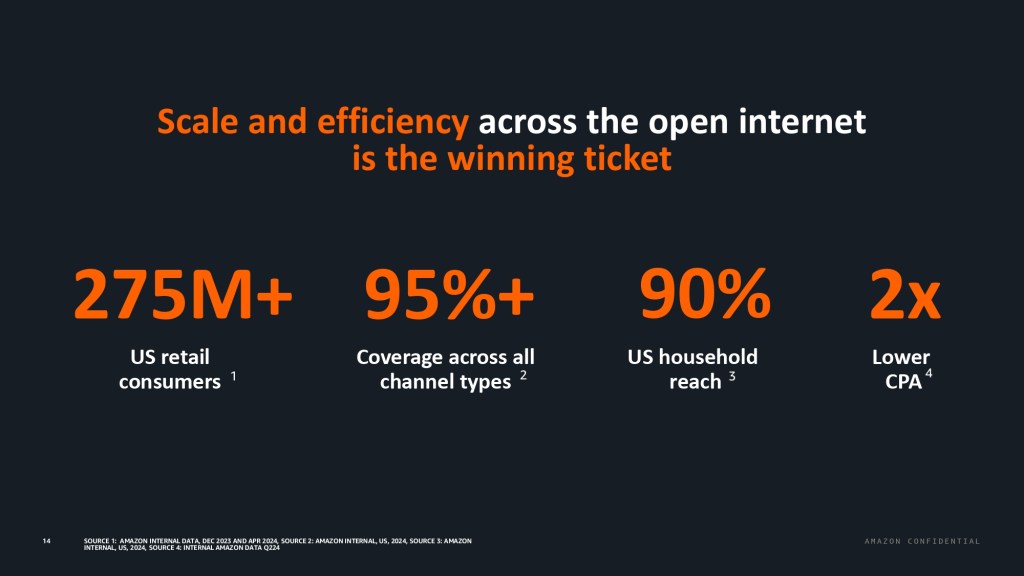 Amazon wants its DSP to be seen not as a tool for buying ads on Amazon but as a top tier gateway to the open web. It even dedicates an entire slide (slide seven) to show just how far that reach goes — apparently up to 90% of the U.S. population. And yes, that puts The Trade Desk directly in the crosshairs, especially in the light of Amazon’s recent moves to undercut the ad tech rival.