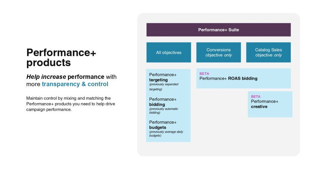 No matter how advertisers plug into Performance+, they’re getting access to two key betas: Performance+ creative and Performance+ ROAS bidding.