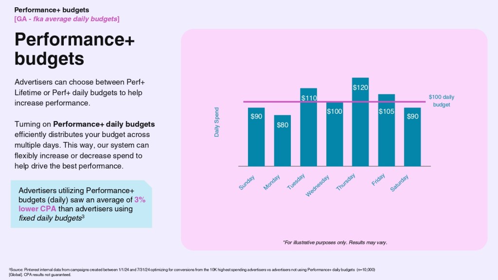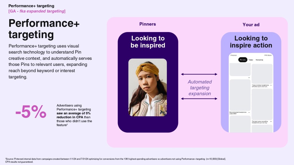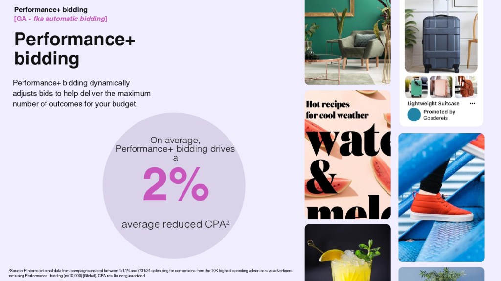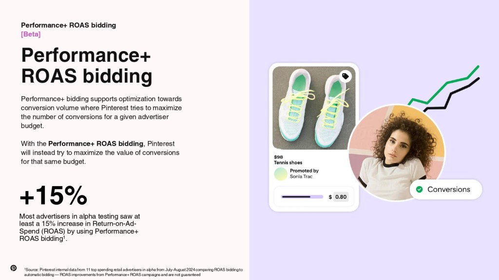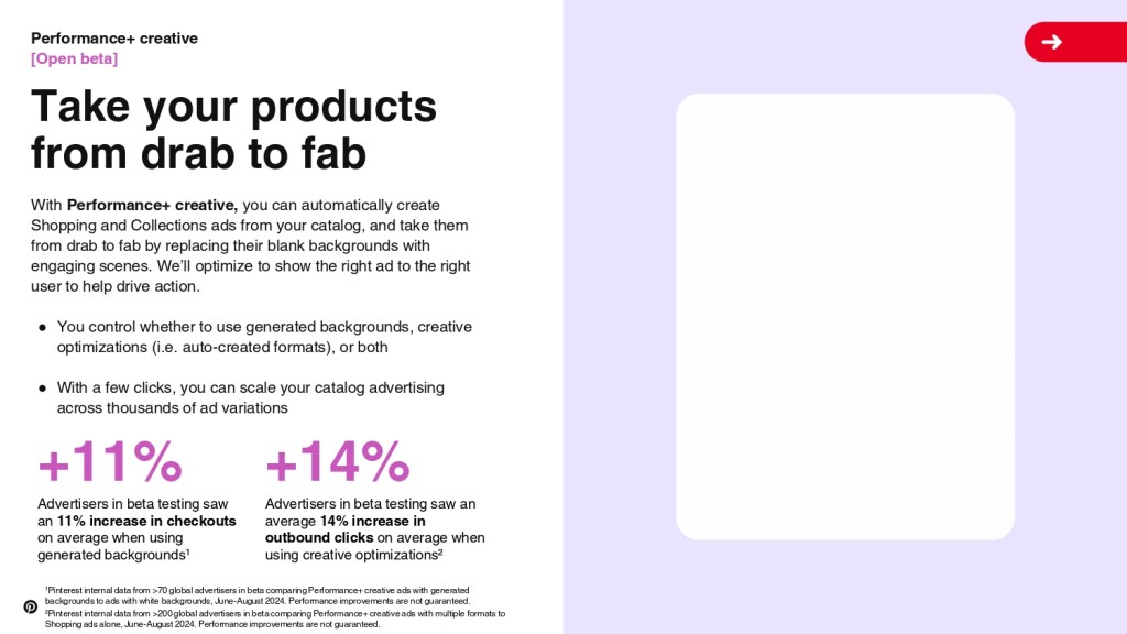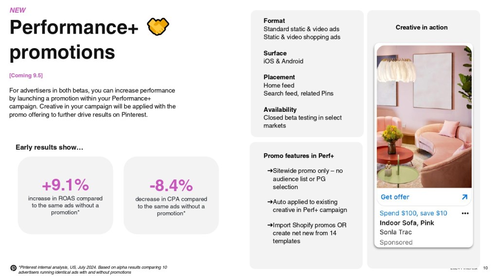 According to the document, Pinterest is set to launch Performance+ promotions on September 5, which enables campaign creatives to be applied with the promo offering. Those advertisers who have already been in alpha testing of the feature saw a 9.1% increase in ROAS, as well as an 8.4% decrease in CPA, compared to the same ads without a promotion, per the deck.