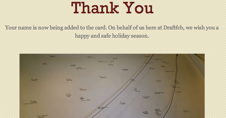 OurGiftFromYou.com is Draftfcb’s offering this year. The site company is making a donation to the Coalition for the Homeless on behalf of its employees and clients, but it wants them each to personally sign a card to accompany it. The site invites users to write their name using their mouse and then to watch via webcam as a machine physically scribes it on a the gigantic card.