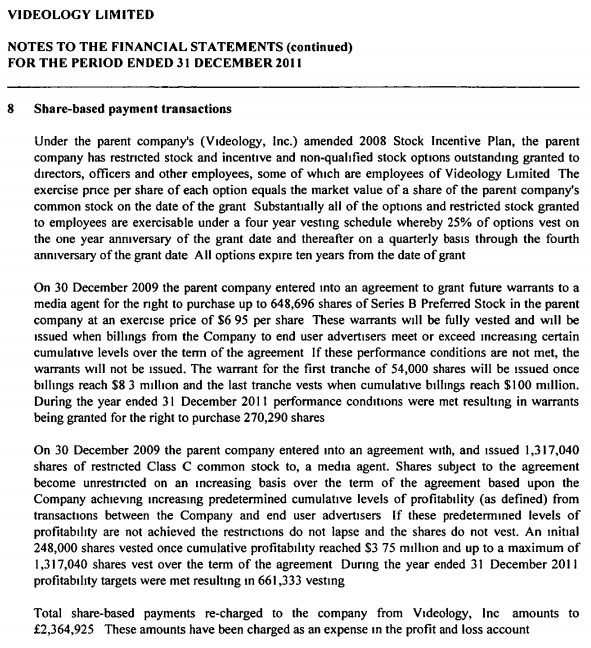 Between 2008 and 2012 Videology issued at least one agency with stock warrants, the value of which varied depending on how much they spent with the vendor, and the overall financial performance of Videology itself. Details of the warrant agreements were outlined in Videology’s 2011 director’s report and financial statements, filed in the U.K. in May of 2012 (see image below.)