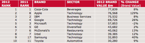 The top 100 Interbrand brands are also most likely to be active (and successful) in social media. Coca-Cola, No.1 on the list, just happens to also be one of the most social brands in digital. According to TrackSocial, Coca-Cola consistently performs well in social media with regards to fan growth, social buzz and spurring engagement. This proves that social media — which might not actually drive purchases of Coke in a direct-response sense — does help the brand with providing value to consumers. Every day, people discuss, debate and embrace Coca-Cola brands in 5,000 online conversations on average.