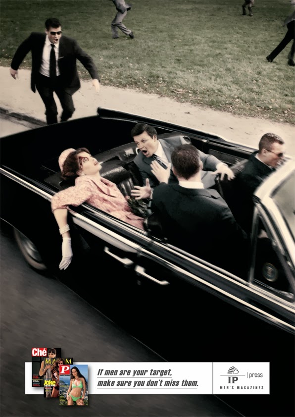 An illustrated (and inaccurate) depiction of the scene at Dealey Plaza just before a bullet shattered JFK’s skull. If you look closely, you’ll see a yellow muzzle flash from a window in the Texas Book Depository Building. That flash represents the “unseen threats” that Mazda’s BLIS (Blind Spot Monitoring System) protects you from. Brilliant and classy. Amazingly, it’s not the most tasteless JFK assassination-riffing ad ever. That would be this 2007 B2B ad for the IP Group of men’s magazines via Belgium. Agency: BBR Saatchi & Saatchi, Tel Aviv. Image: Best Ads on TV.