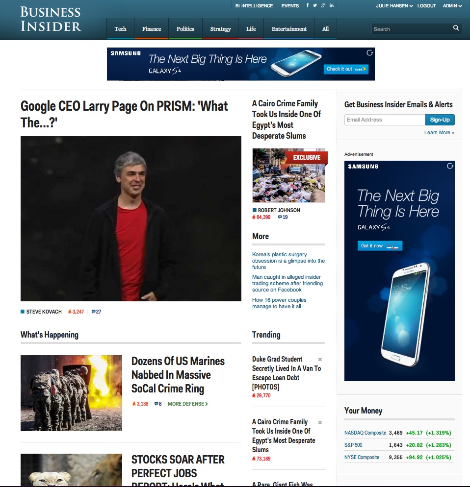 Another priority for BI when refreshing its site was to make its ad units more prominent. Increasingly, advertisers only want to pay for the impressions that users can actually see, so BI is doing its best to ensure its ad units render above the fold regardless of screen size. According to Hasen, ad viewability was a critical goal. Things like a smaller header and a condensed navigation menu have helped it achieve that. Its homepage skin ads now wrap around the editorial content more gracefully, too.