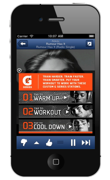 For example, it has more than 100 branded stations where advertisers attach their brand to songs that fit a particular theme. Pandora worked with Gatorade to create three workout stations — warmup, workout, cool down — all associated with the sports drink’s G series. Over the course of the two month campaign, it ran more than a half million station ads, and the target audience, teens, wound up, on average, listening to over an hour. Ninety-six percent of all station additions for the campaign happened on mobile.