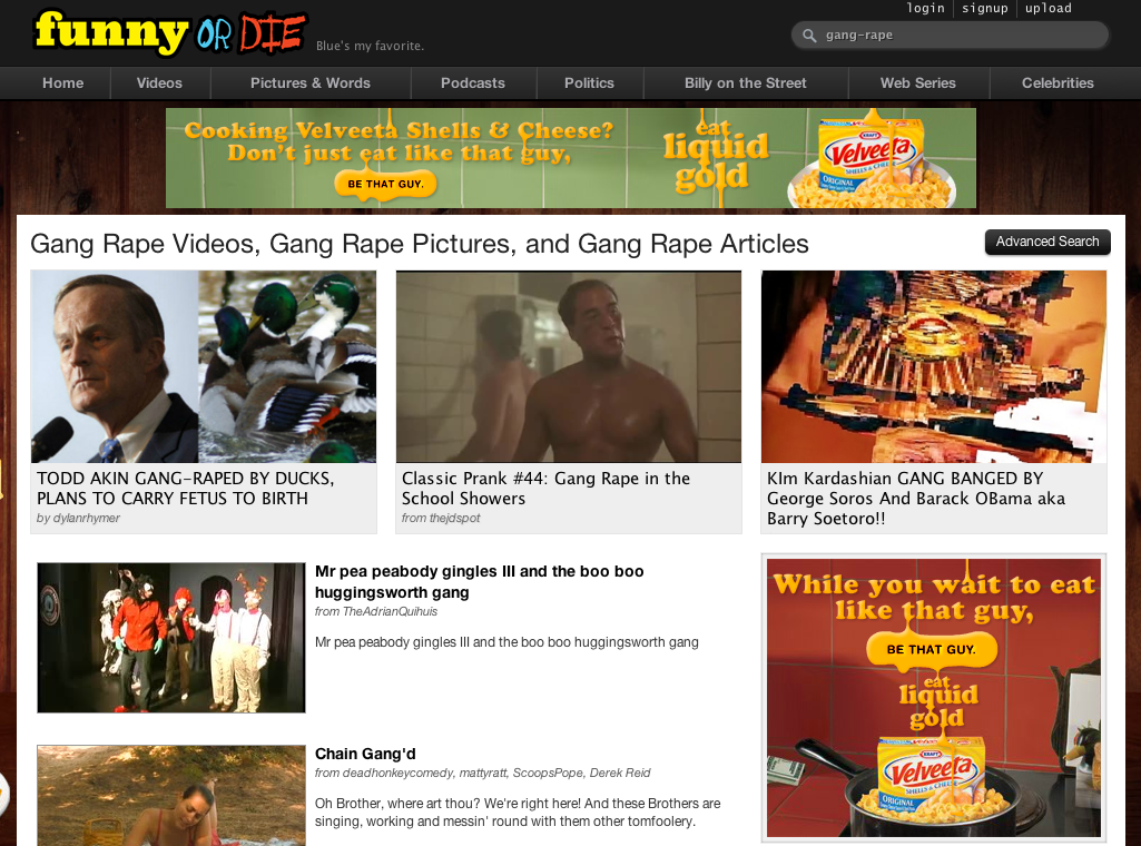 Because of the SEO techniques used by Funny Or Die, landing pages are automatically generated for thousands of terms, including “rape videos” and even “gang rape.” Searches for some of those terms drives significant traffic to the site.