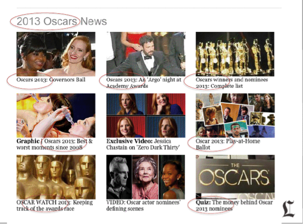 The paper started planning for the Oscars in the fall of 2012. Researching the last eight years of key search terms, the L.A. Times began creating content around keywords like Oscars, red carpet and Academy Awards. From October until February, it published hundreds of stories, linking back to its Oscars landing page, where a visitor found “Oscars 2013” repeatedly mentioned.