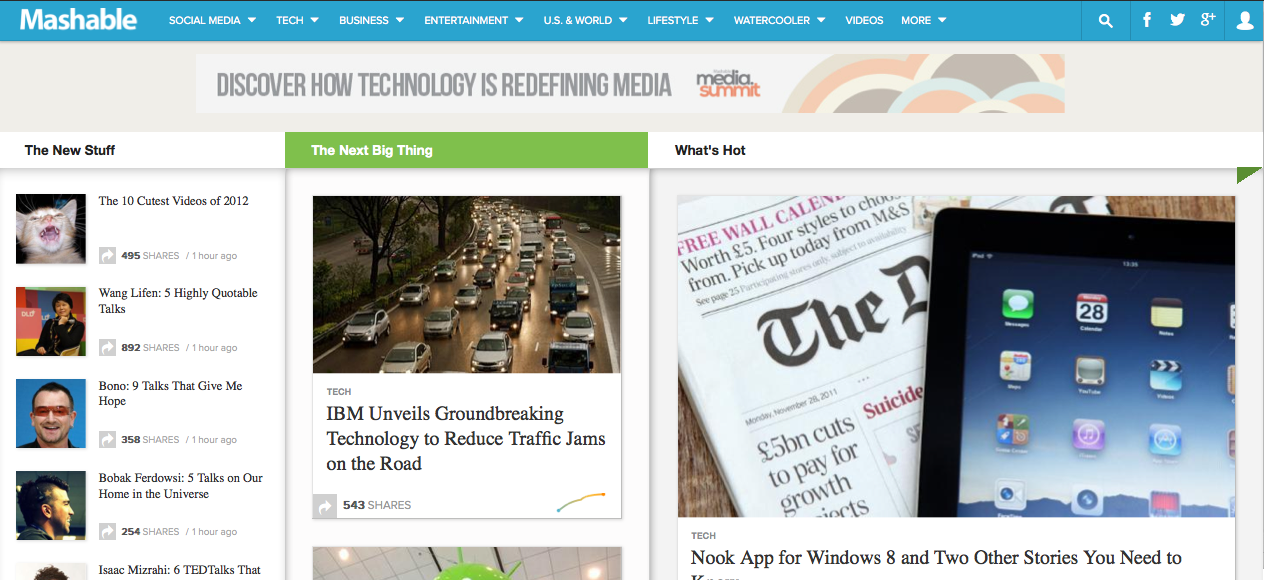 The company also built a predicted platform called Mashable Velocity, which finds the content that bubbles up and has a high chance of going viral. These stories will sit in a well called The Next Big Thing, and Mashable editors will be the ones making the call on whether or not to feature the content. The content selected for The Next Big Thing also gets promoted via social media.