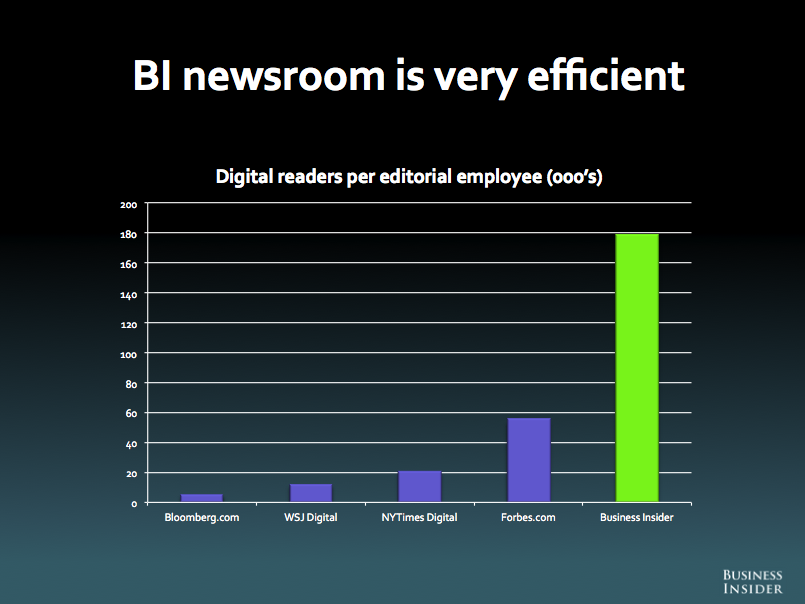 There’s one slide missing from Blodget’s open-kimono presentation: revenue and profit. There’s no way to know how truly successful this approach is without knowing that. TBI is undeniably a runaway hit in the pageview world. It is clearly a more efficient machine for generating pageviews than Forbes or the New York Times. Yet it’s hard to see the revenue per user equaling out. Blodget’s point to me is that the NYT will continue to get a premium, but that premium will come down, as its own execs have hinted in blaming programmatic ad buying on declining display rates. The bet then is that the publisher with the lower cost base will weather the storm the best. Forbes, with its editorial staff now numbering 1,000 contributors, is making a similar bet that it can churn out pageviews more cheaply and still command a premium in the market.