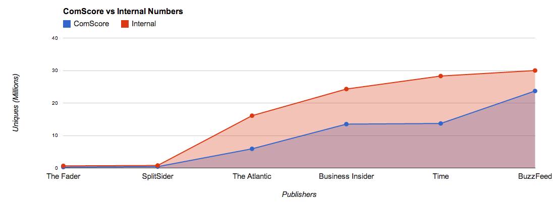 BuzzFeed: The social publisher likes to tout its global audience of 50 million. But when it comes to ComScore, that audience gets a lot smaller. In fact, it tracks 56.8 percent fewer unique visitors, at 21.6 million.