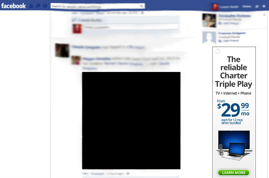 The ad for Charter communications shown below was served on Facebook by a browser plugin called Rewards Arcade, which is widely considered malware. Facebook itself doesn’t currently sell IAB standard display units. The software also injected leaderboard ads into Dropbox’s website, which doesn’t usually serve ads at all.