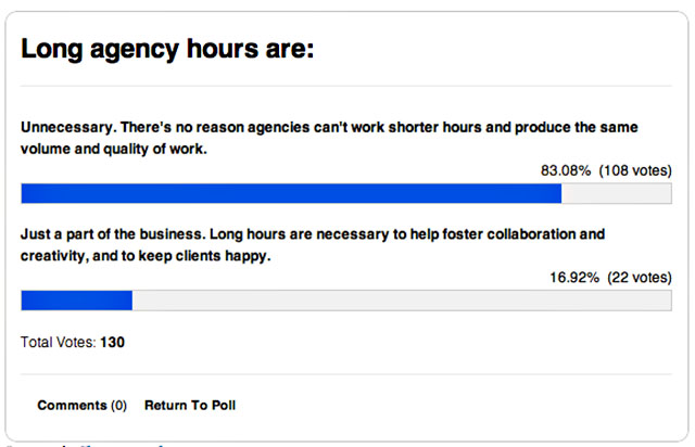 The role of agencies is in constant flux. One mainstay of the agency business: long hours. Jack Marshall wrote that the tradition of putting in absurdly long hours, and wearing them like a badge of honor, is unnecessary and ultimately counterproductive to fostering creativity. Digiday polled its readers to get a sense of whether this aspect of agency culture needed to change. A staggering 83 percent out of 130 polled think that advertising agency employees are terribly inefficient getting the job done.
