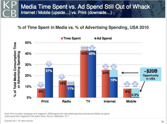 This has long been a Silicon Valley canard, dating back to Internet analyst-turned-venture capitalist Mary Meeker’s famous slide showing the amount of time spent online compared to the amount of money spent by brands. This slide has been in VC pitch decks since the dawn of the Web.