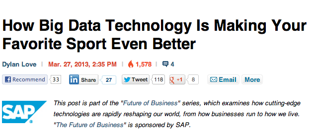 When a brand pays a publisher to have its name and/or message associated with a particular story. This typically takes the form of a brief intro paragraph informing readers that the following article is sponsored by an advertiser. You’ll see phrases like “brought to you by,” “presented by,” or “sponsored by.” This is not content produced by the brand. The marketer is given a broad topic area that it can choose to associate its brand with. The marketer does not get a say in what will be produced, at least not in the type of sponsored content programs run by sites like Mashable, Business Insider and Digiday.